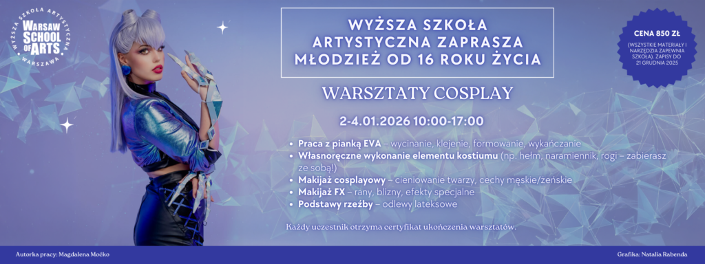 Wyższa Szkoła Artystyczna zaprasza na warsztaty COSPLAY, które łączą kreatywną zabawę z nauką praktycznych umiejętności z zakresu charakteryzacji i pracy nad kostiumem. 🎭